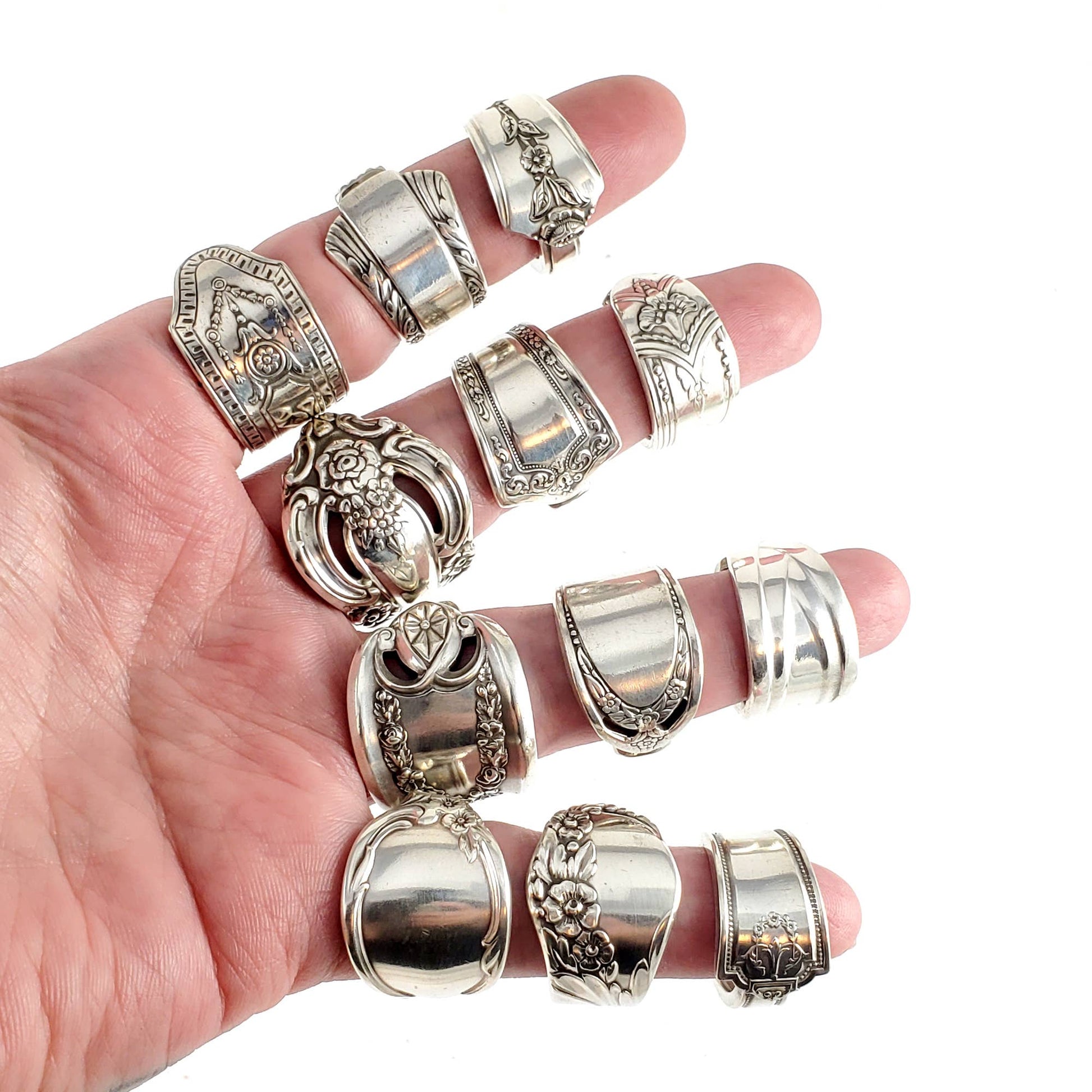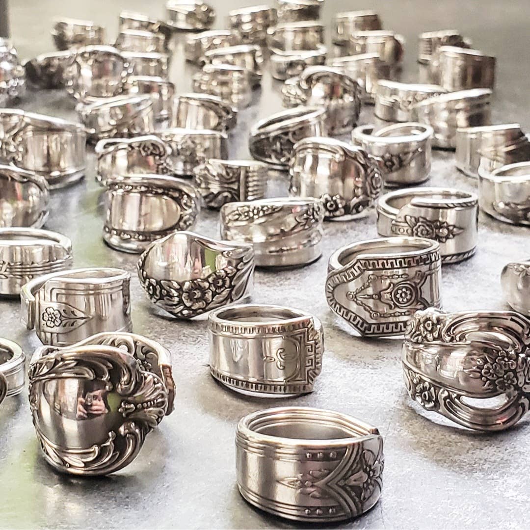 Silverplate spoon rings in a range of sizes. All of our spoon rings are handmade using actual vintage spoons. Patterns will vary depending on what we have in stock.