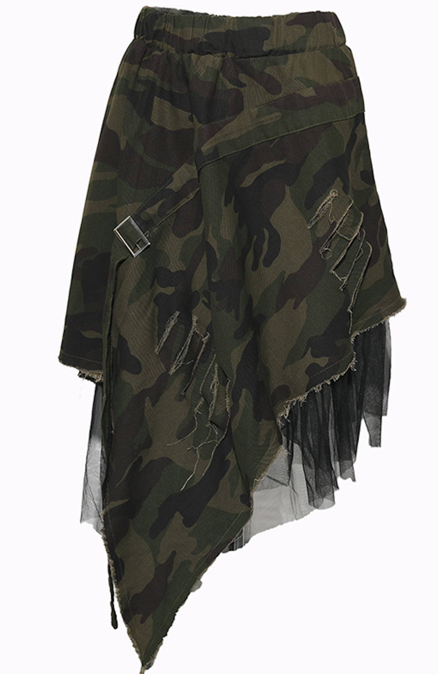 A seasonless and chic skirt to wear with everything from tanks to sweaters. Camouflage pattern asymmetrical skirt with elastic waist, tulle trim attached.