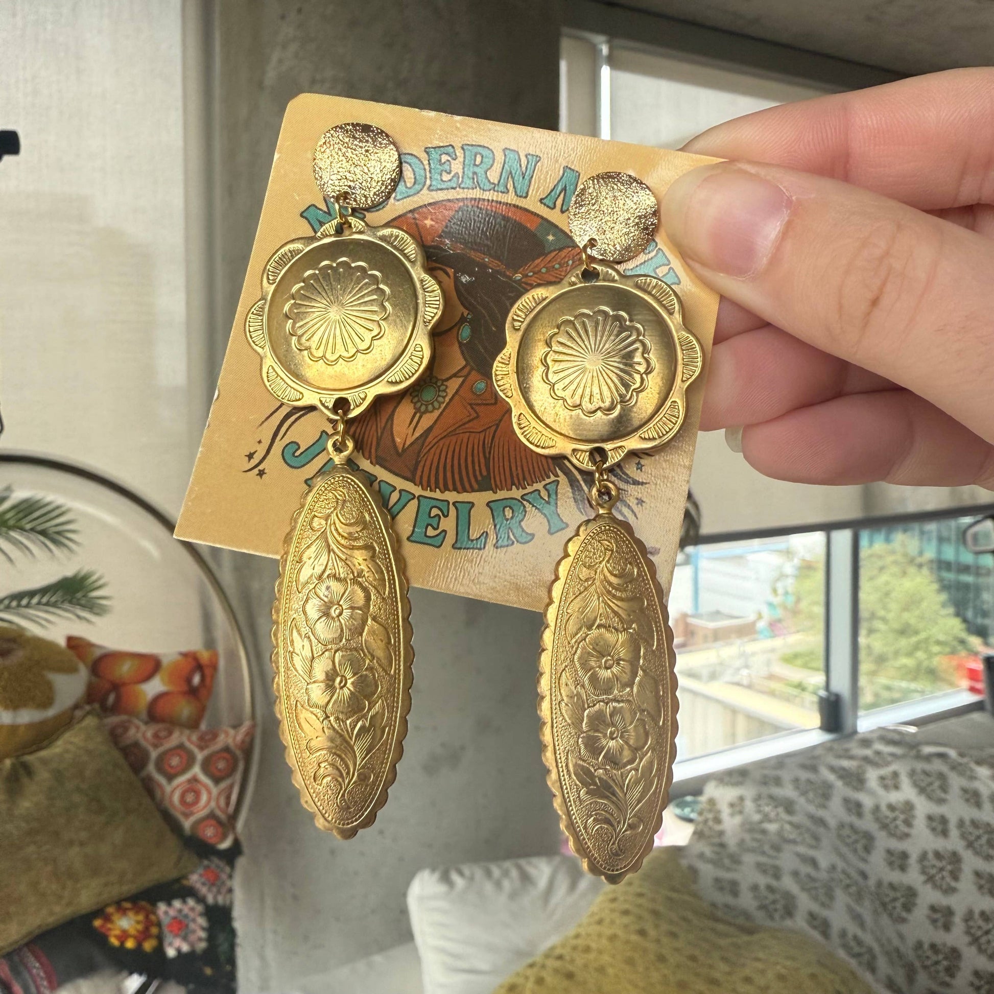 Vintage-inspired and lightweight, these earrings feature brass conchos paired with intricate floral brass pendants. Finished with stainless steel post