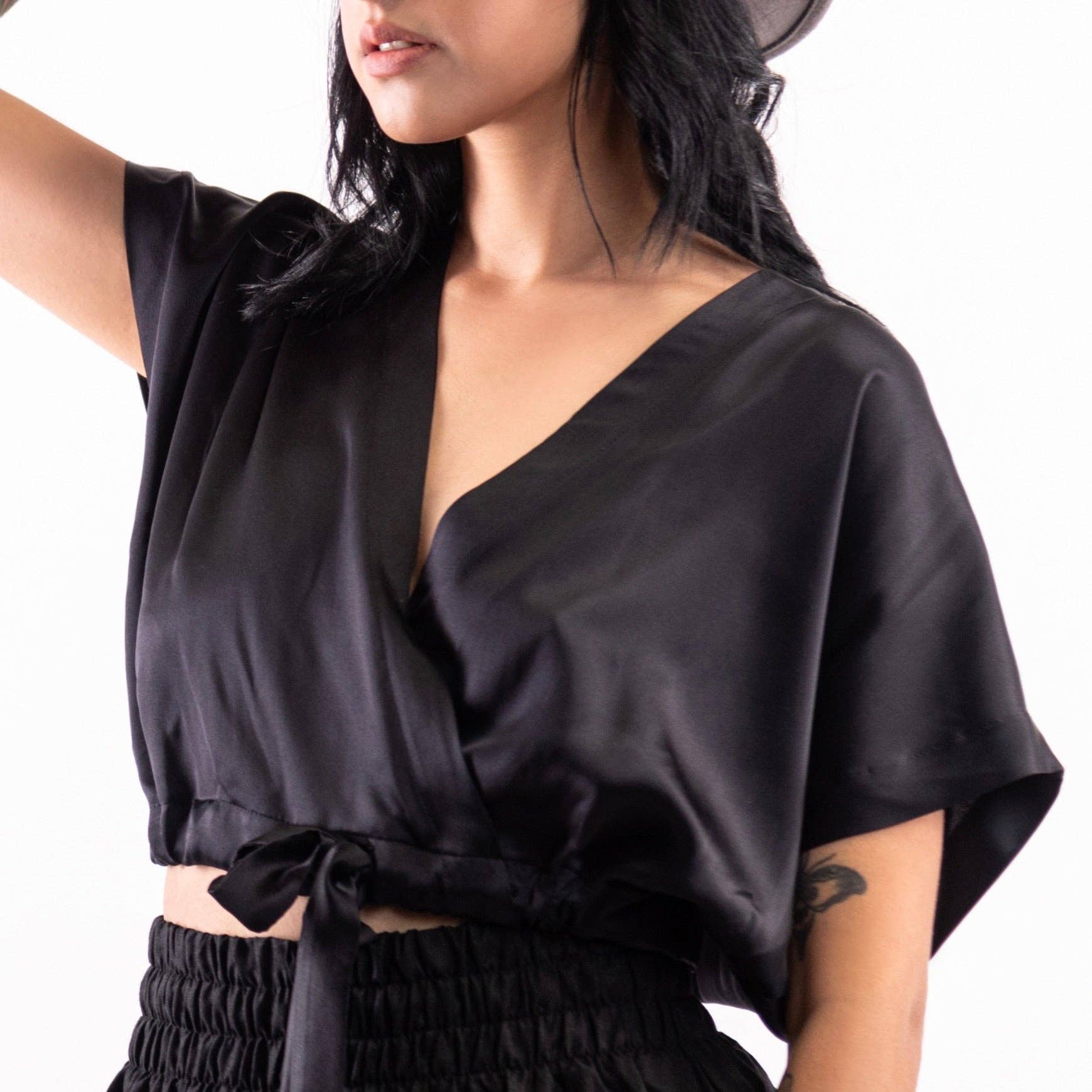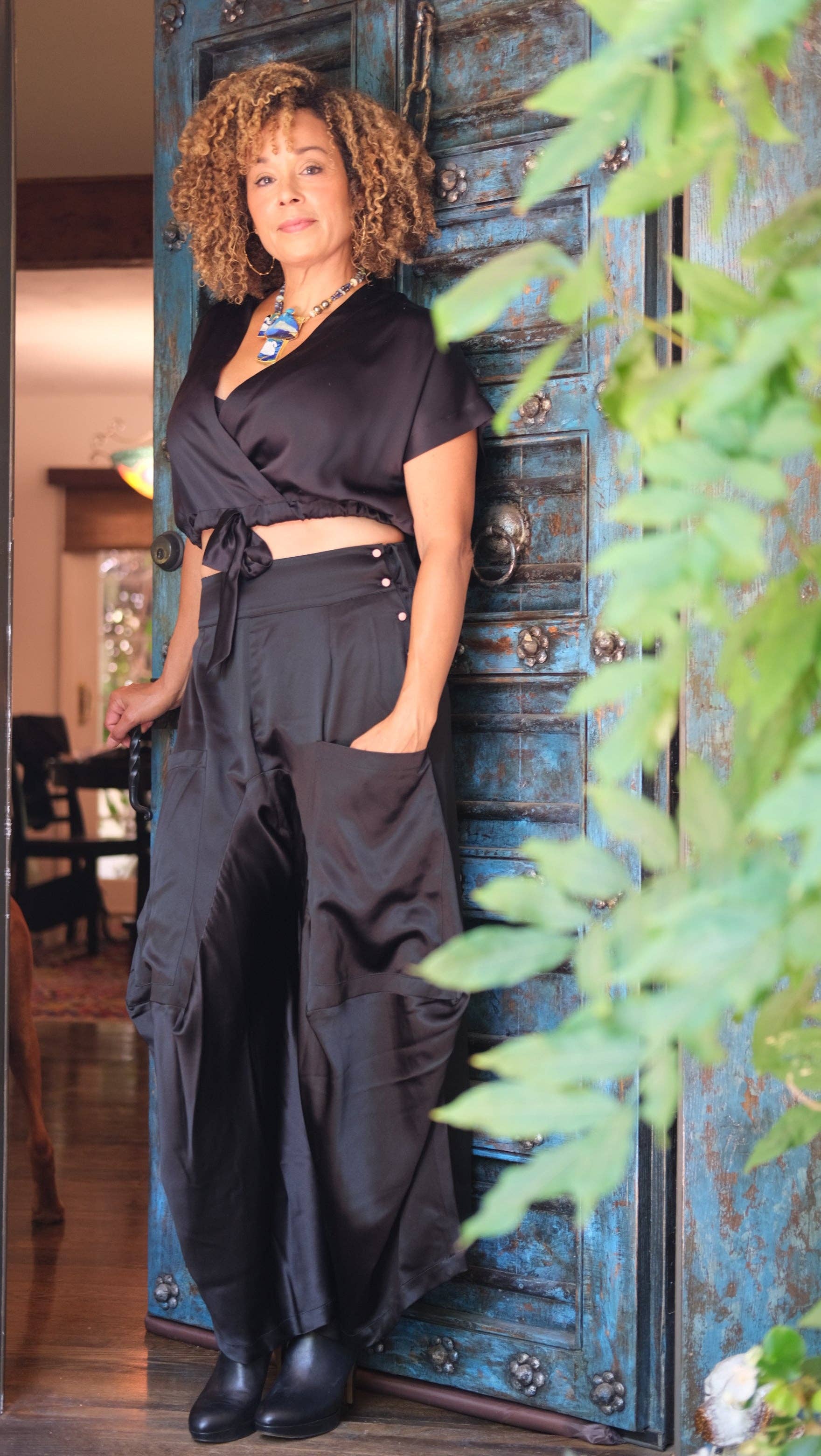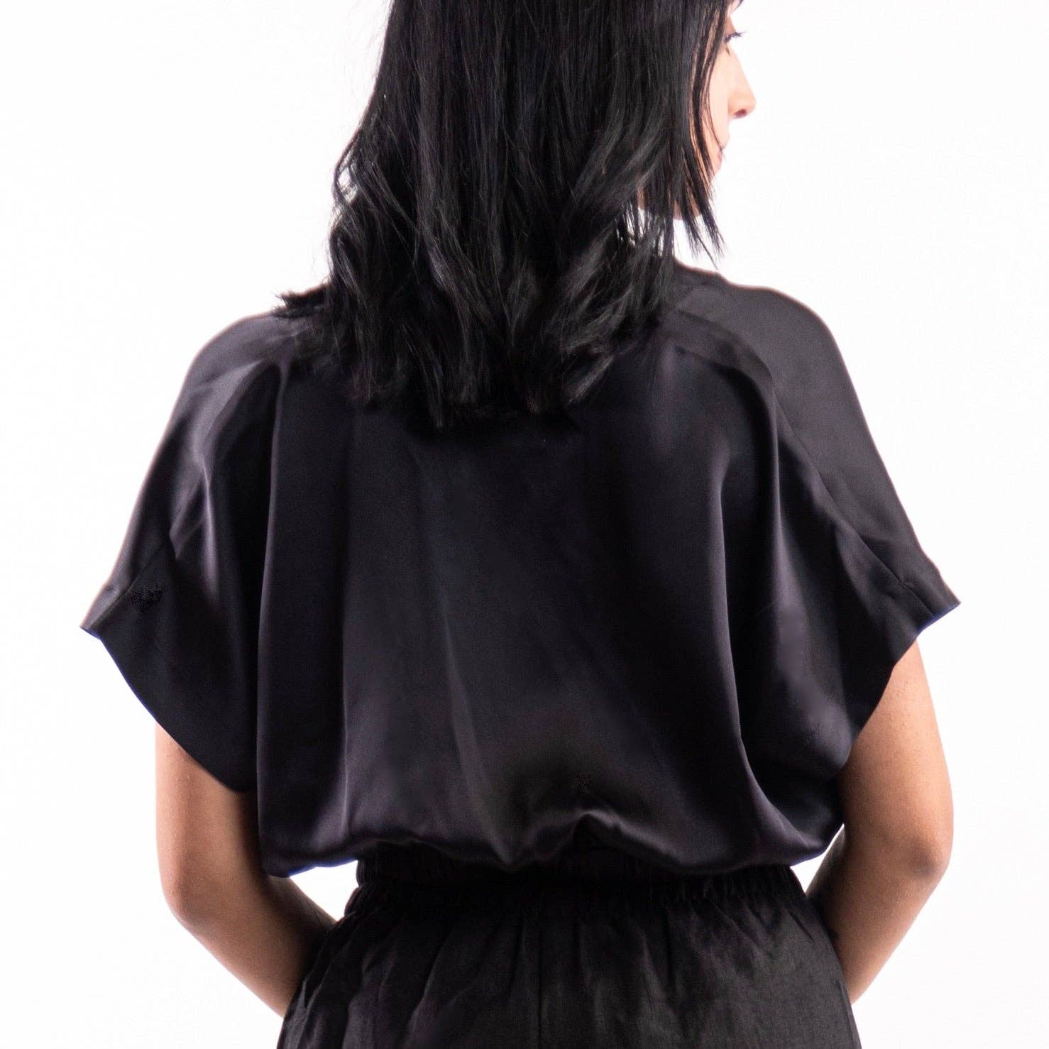 More than a feeling. Exclusive custom design, 100% silk charmeuse, slight dolman sleeve and waist cinch. Sensational to the touch. Pairs perfectly with matching skirt or silk pants, also available.