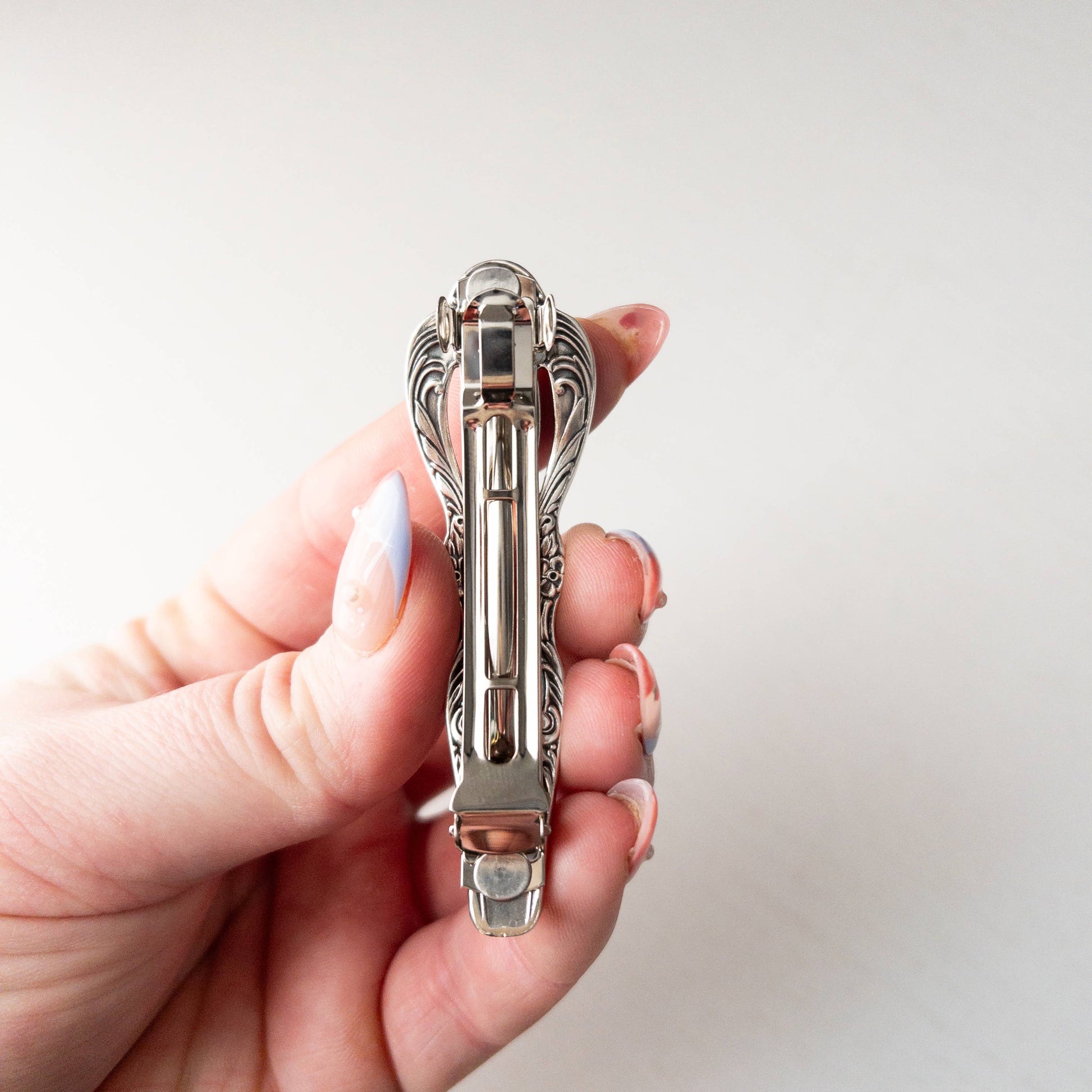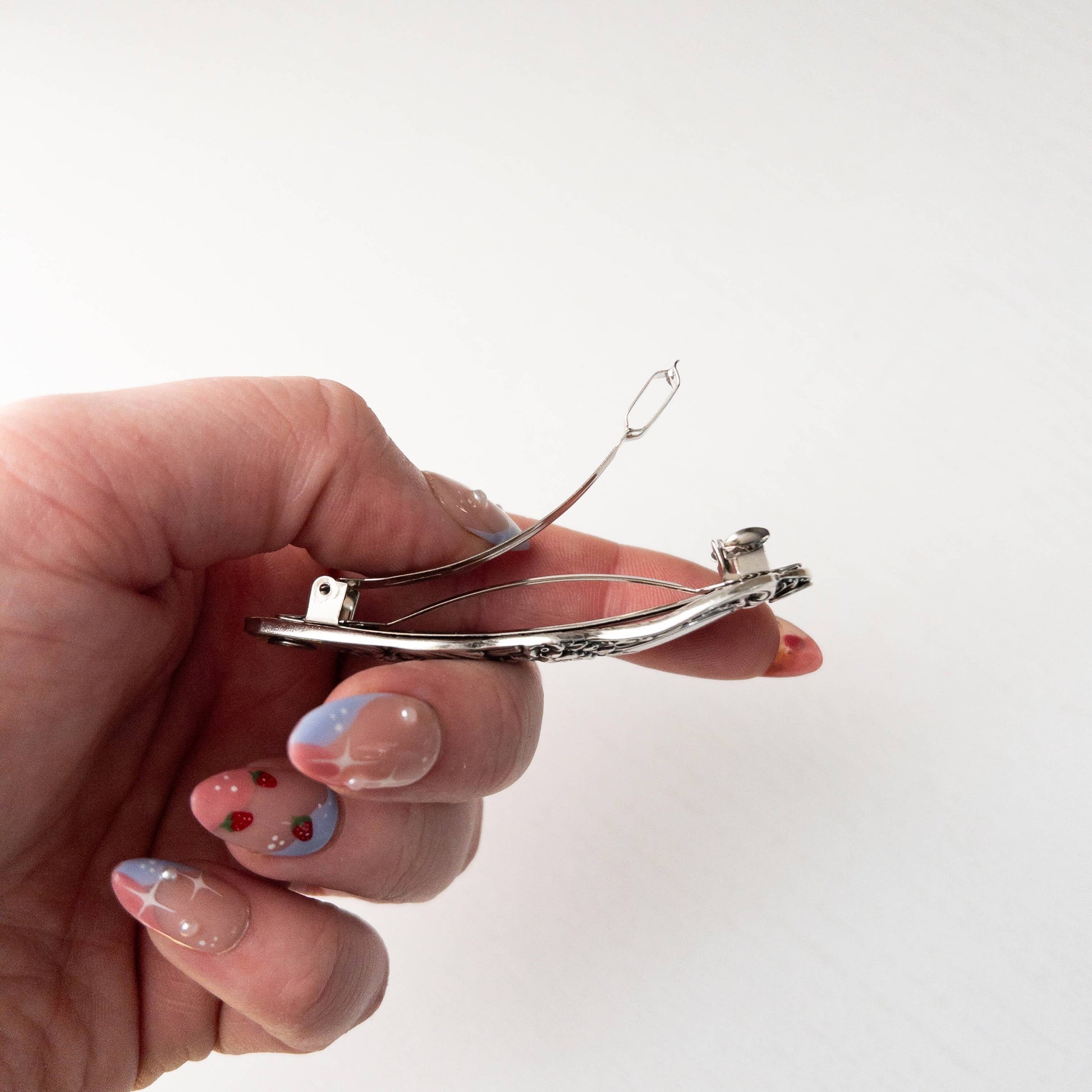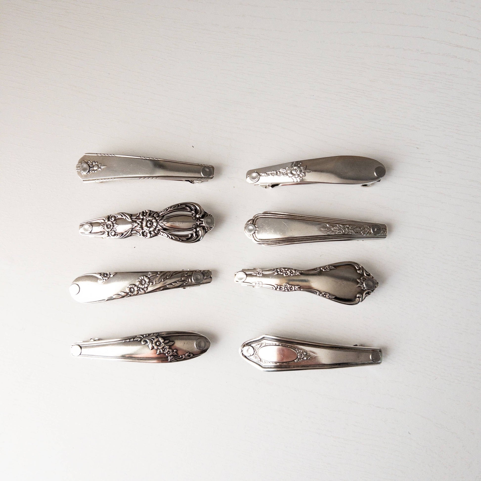 These stunning hair barrettes are crafted from antique silver plated silverware handles. They have been lovingly cut, sanded and attached to a classic barrette fastener. They are easy to put on and take off, and they give a unique upgrade to a classic look.