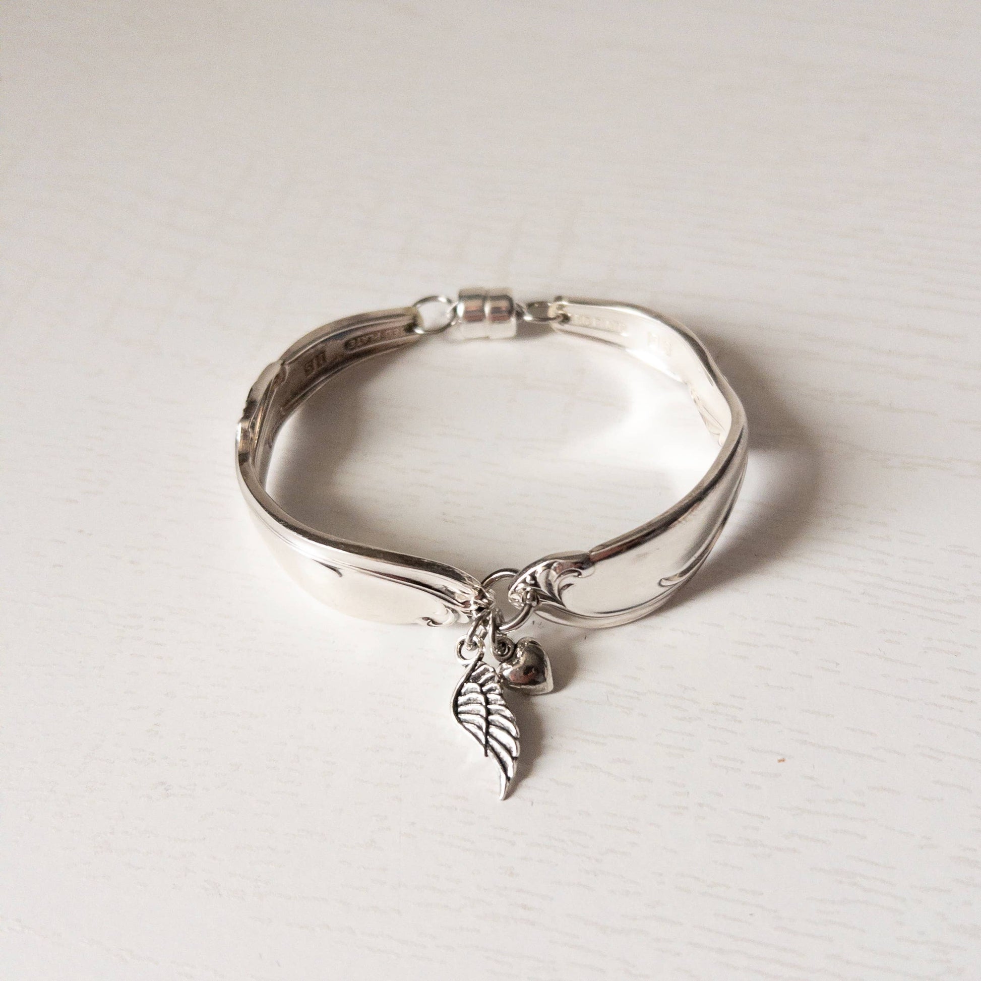 The bracelet is our classic silverware handle bracelet, made from two vintage silverplate silverware handles attached in the center and finished with our signature heavy duty magnet for easy wear. We've added a wing and heart charm in the center to dangle prettily. This bracelet is size to fit a 7" wrist, if you need an adjustment just leave a note or send us a message!